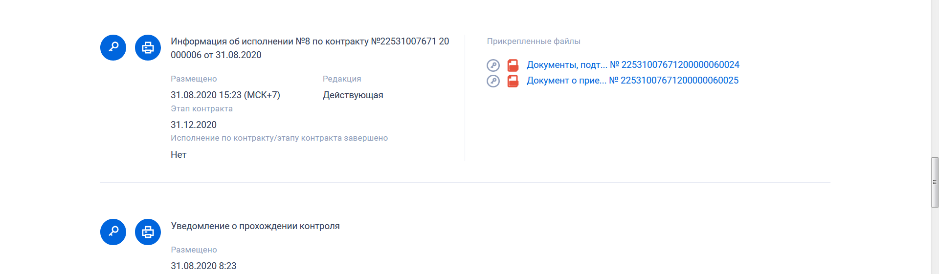 В документе «Информация об исполнении контракта» указывается порядковый номер информации, следующий за номером информации об исполнении контракта, размещенной на ЕИС. Например, в ЕИС размещена информация об исполнении №8 по контракту №2253100767120. Следовательно, при формировании следующей информации об исполнении данного контракта в поле «Номер исполнения в рамках этапа» необходимо указать цифру 9. Таким образом, появится следующая запись: информация об исполнении №9 по контракту №2253100767120.