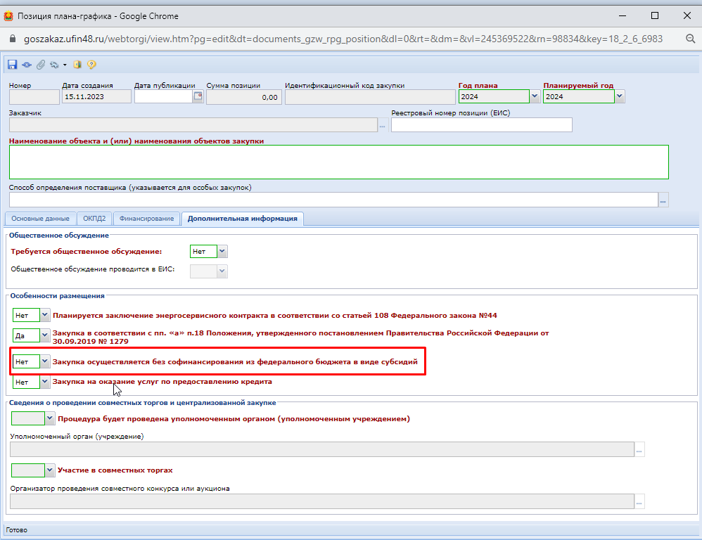 Рис. 2. Установка признака «Закупка осуществляется без софинансирования из федерального бюджета в виде субсидий» в позиции плана-графика закупок |